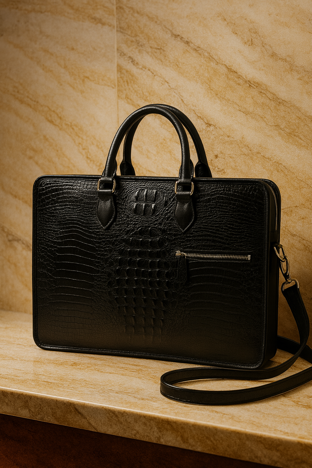 A bold executive brief crafted with a structured silhouette and crocodile-texture leather finish. Designed for professionals who want authority, function, and understated luxury in one carry.